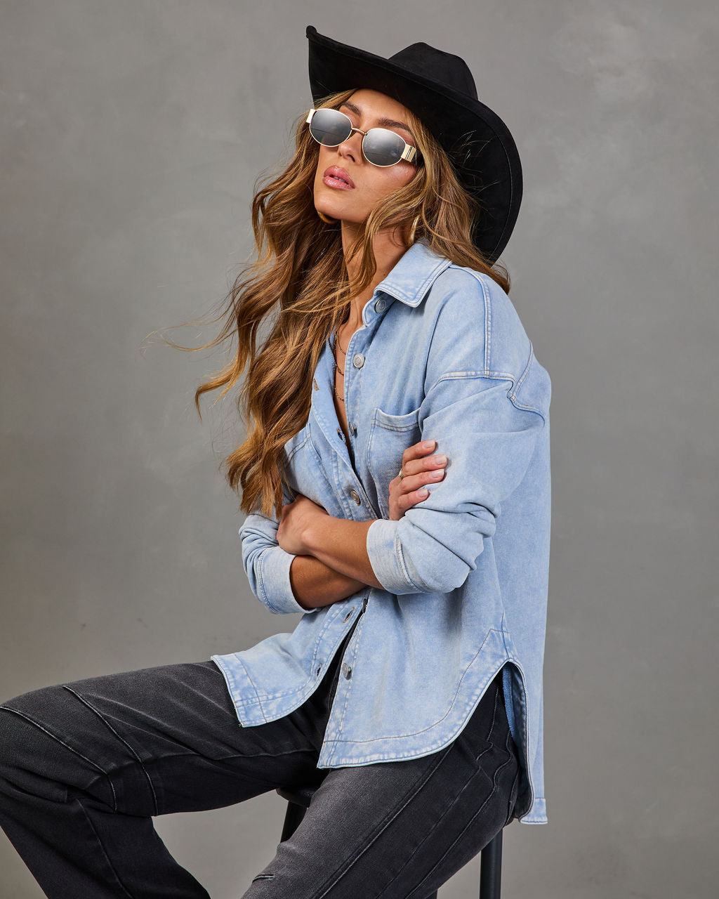 Effortlessly flirty and undeniably chic. the Alvina Collared Chambray Shirt is your new wardrobe staple for casual days with a feminine twist. Made from lightweight chambray fabric. this shirt feels soft and airy. perfect for layering or wearing solo. A curved hem softens the silhouette. making it easy to style tucked into skirts or left loose over your favorite jeans.