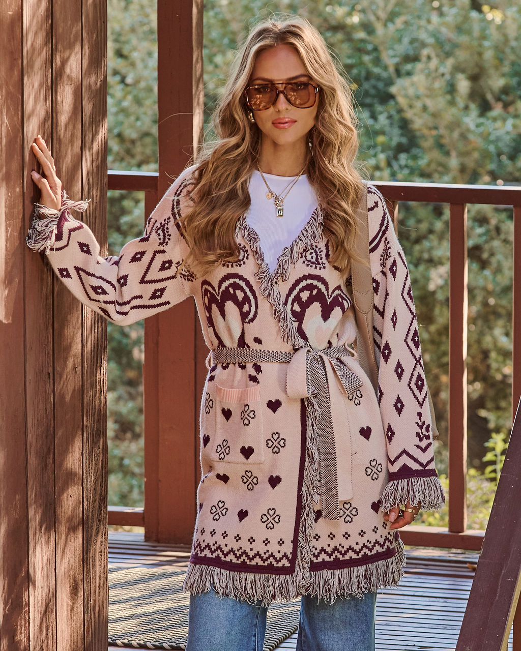 Effortless yet eye-catching. the Anneston Cardigan is the perfect blend of comfort and high-end style. Made from a midweight knit jersey. its bold abstract design stands out against a winter grey backdrop. The comfortable stretch fabric and playful fringe trim add personality to any outfit. Cinch it with the detachable waist tie for a defined silhouette. or wear it open for a more relaxed look.