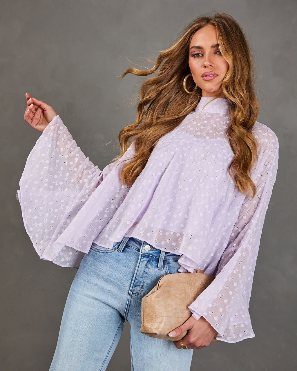 Breathe in the romance of a Parisian morning with a blouse that's pure poetry. The Balcony Breeze Floral Eyelet Blouse is effortlessly elegant. made from a lightweight. semi-sheer floral eyelet fabric. It features graceful kimono sleeves and a sophisticated mock neck with an attached tie closure. An attached camisole lining with adjustable straps ensures comfort and coverage. For a dreamy. coordinated outfit. pair it with the matching Balcony Breeze Tiered Floral Eyelet Mini Skirt (sold separately).