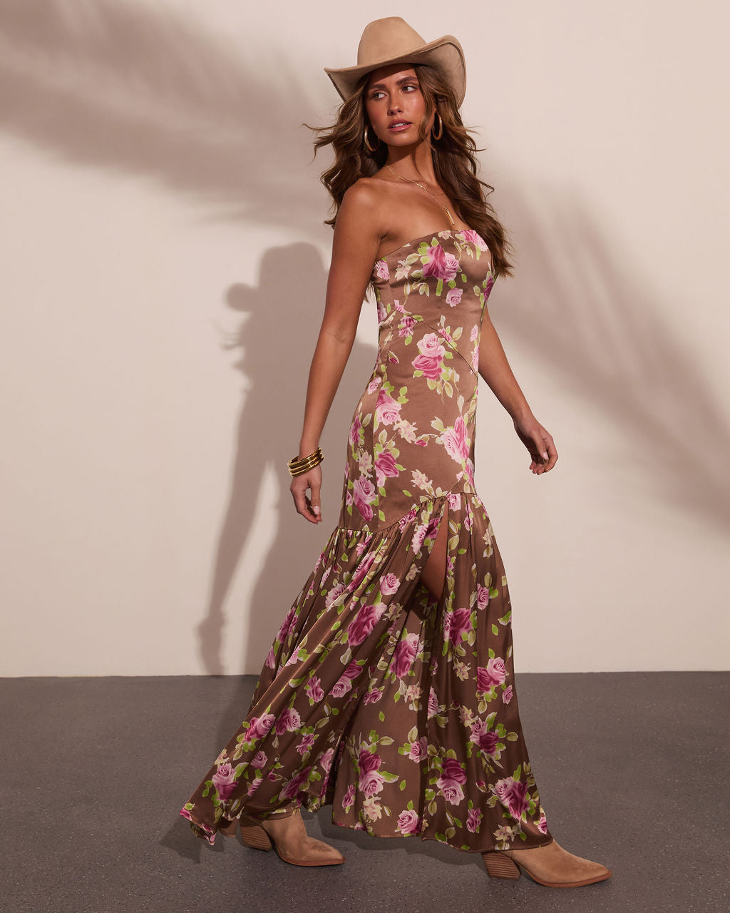Cancel your other plans. because this look demands its own debut. The Bandit Bloom Strapless Floral Maxi Dress brings pure magic to your festival lineup. Designed in a rigid. non-stretch floral satin. it features a secure strapless neckline with a non-slip silicone grip trim so you can dance freely. A stunning pleated flounce hem with a bold slit detail finishes the vibe.