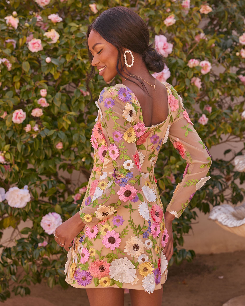 Give your wardrobe the floral wake-up call it's been dreaming of. The Bloom Ahead Mesh Floral Applique Mini Dress is pure joy in dress form. featuring a stunning mesh fabric overlay that brings serious texture play to your look. With 3D floral applique that practically pops. plus sheer sleeves and subtle puff detail at the shoulders for that perfect dose of soft romance. It's the ultimate feminine pick for your next day event or guest-of-wedding moment.