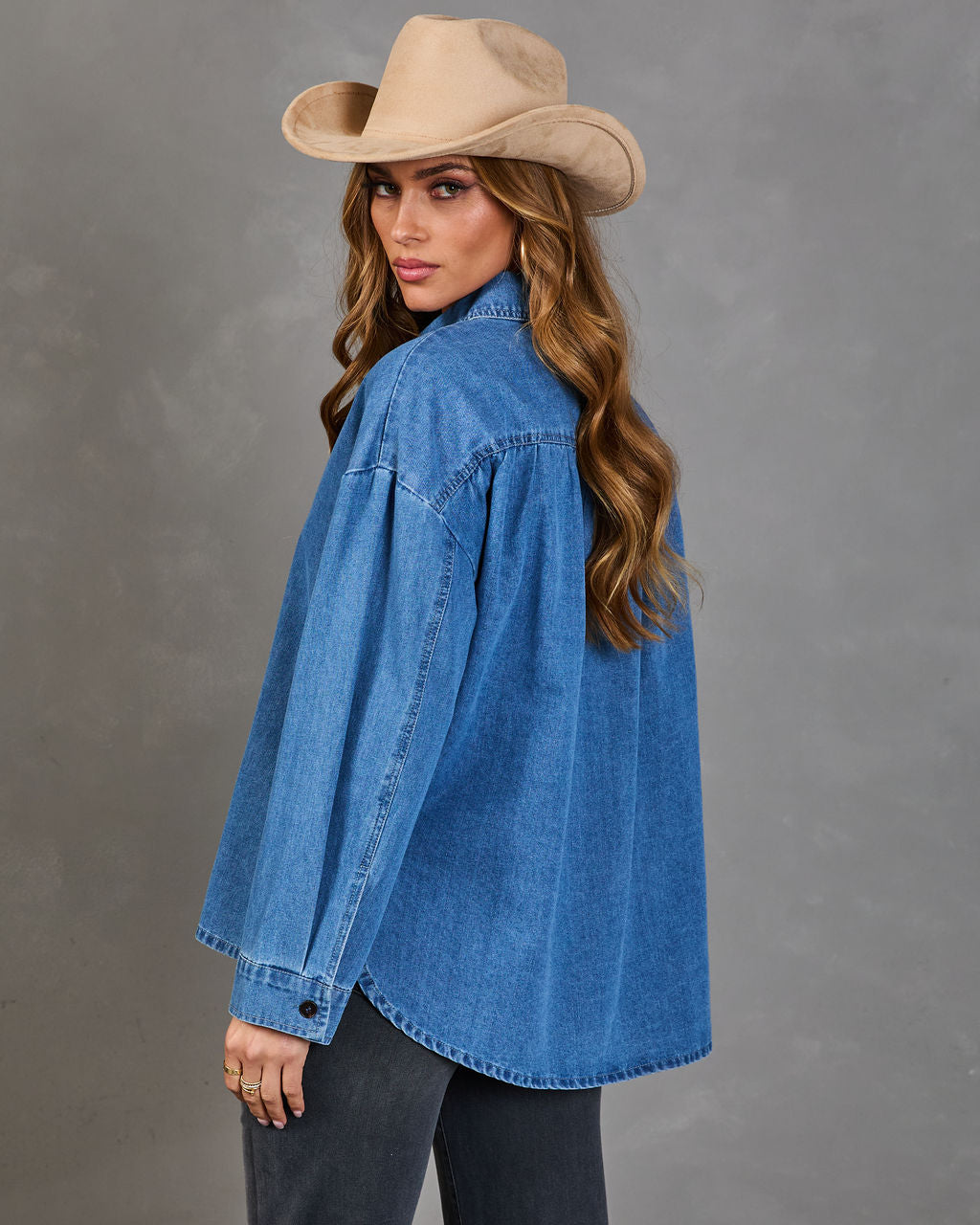Unlock a trove of timeless style with your new go-to denim essential. The Blue Treasure Denim Button Down Top reinvents the classic chambray with a chic. modern twist. Made from structured lightweight denim. it features a sharp collared neckline and banded buttoned cuffs for a polished finish. The curved shirttail hem with side seam slits adds a relaxed. feminine flow. Perfect for layering or wearing solo. this top brings effortless sophistication to any casual look.