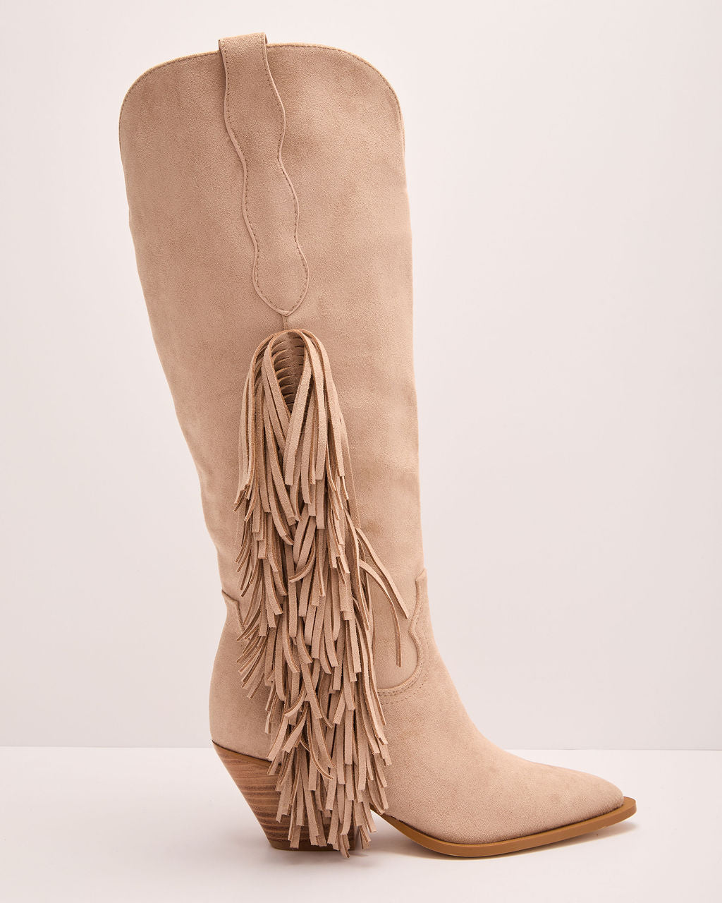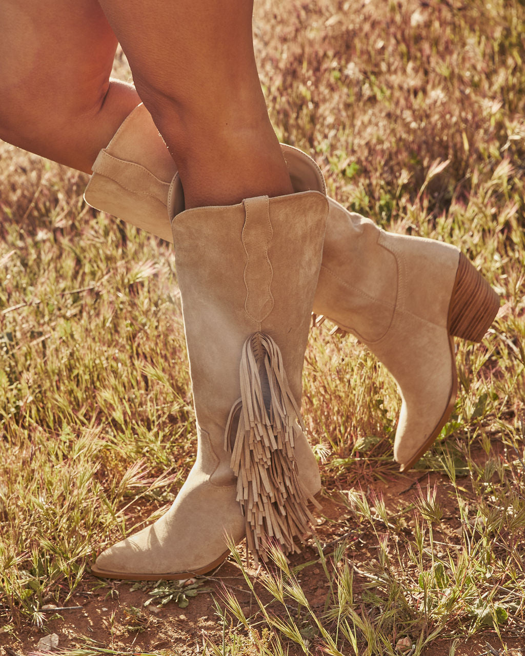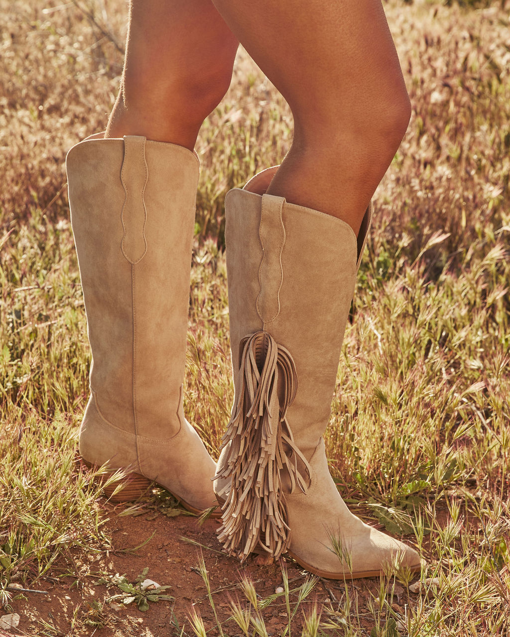 Kick up some desert dust and make your entrance unforgettable with the Boho Canyon Faux Suede Fringe Western Boots! Ready for wild nights out with your girls. these pointed toe beauties serve up major festival magic. Slip into the easy pull-on styling and let the soft suede fabric hug your feet. The playful fringe side panel dances with every step you take. Your ultimate sidekick for sun-soaked adventures is here!- Heel Height: 2.3"