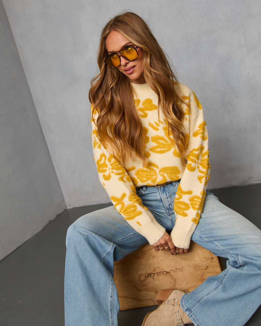 Bring vibrant colors and textured prints to your fall wardrobe with the Chilly Days Textured Floral Sweater. It has a mock neck. ribbed trim. drop shoulders. and large textured flowers all over. Balance out this bold top with muted. basic bottoms.
