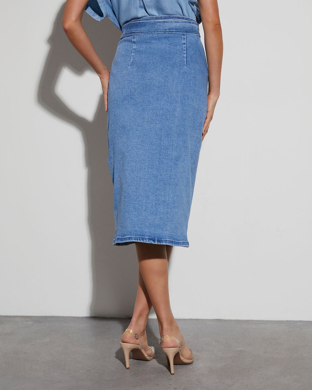 Meet your new wardrobe essential: the Class Act Denim Wrap Midi Skirt! This chic skirt brings a fresh twist to classic denim. featuring a stylish wrap front that adds just the right amount of flair to any look. Made from soft. stretch denim. it offers a comfortable fit while keeping its shape for all-day wear. The midi length is perfect for dressing up or down—pair it with a tucked-in blouse and heels for a polished vibe. or go casual with a tee and sneakers.