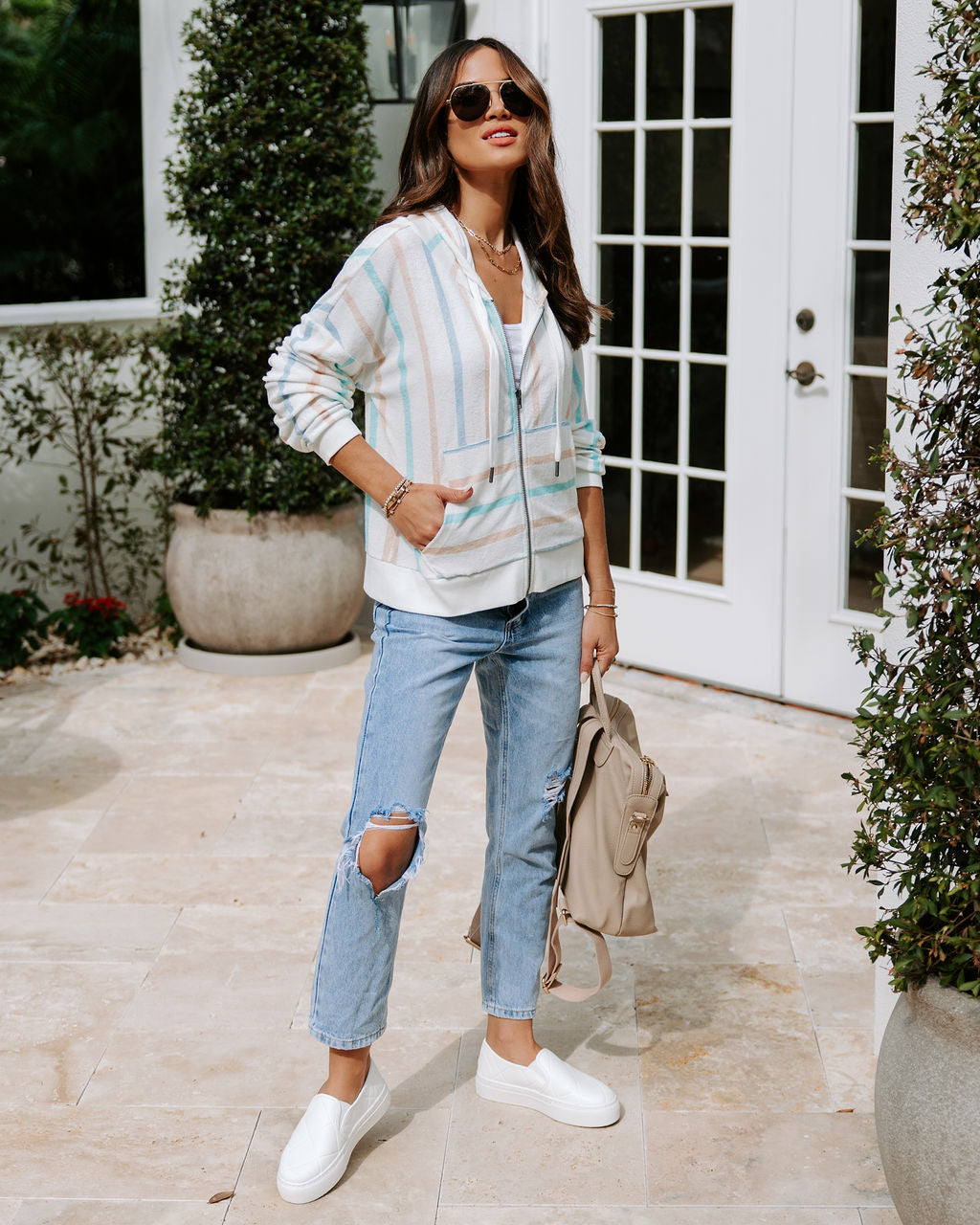 The Clevelander Terry Striped Zip Up Sweatshirt is beach vacay ready. featuring a hoodie and ties for those chilly sunsets.