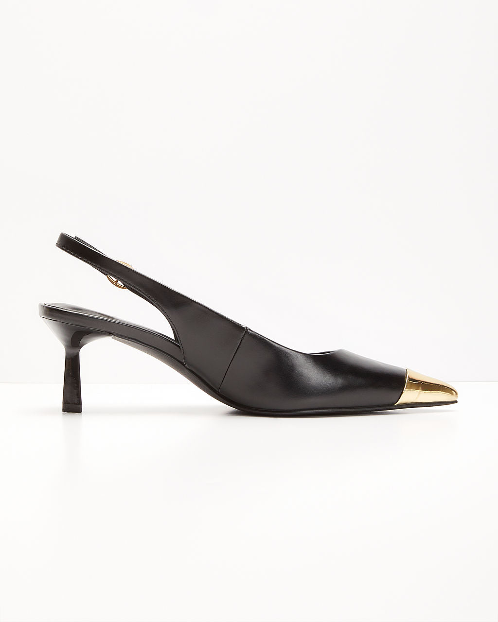 The perfect pumps for work and play have arrived. The Denzel Metallic Tip Slingback Heels feature a low. kicked-in stiletto heel and a statement. gold metallic pointed tip. Finished with an adjustable ankle strap for comfortable wear.