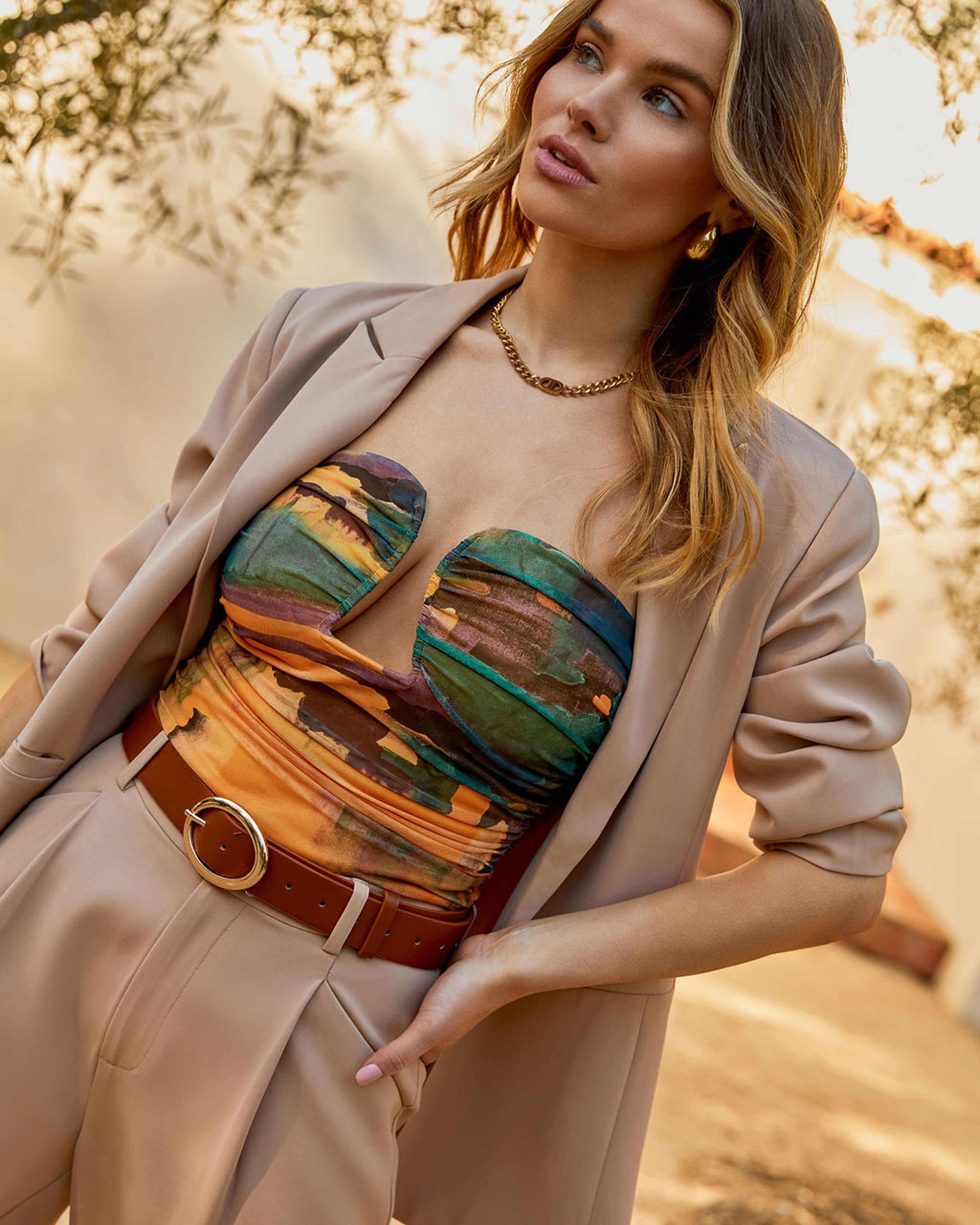 With a structured. center cutout and flattering ruching. this bodysuit is the star of your next outfit. Made from trendy mesh fabric with a bold print. we love this paired with a power suit or fitted. high-waisted jeans.