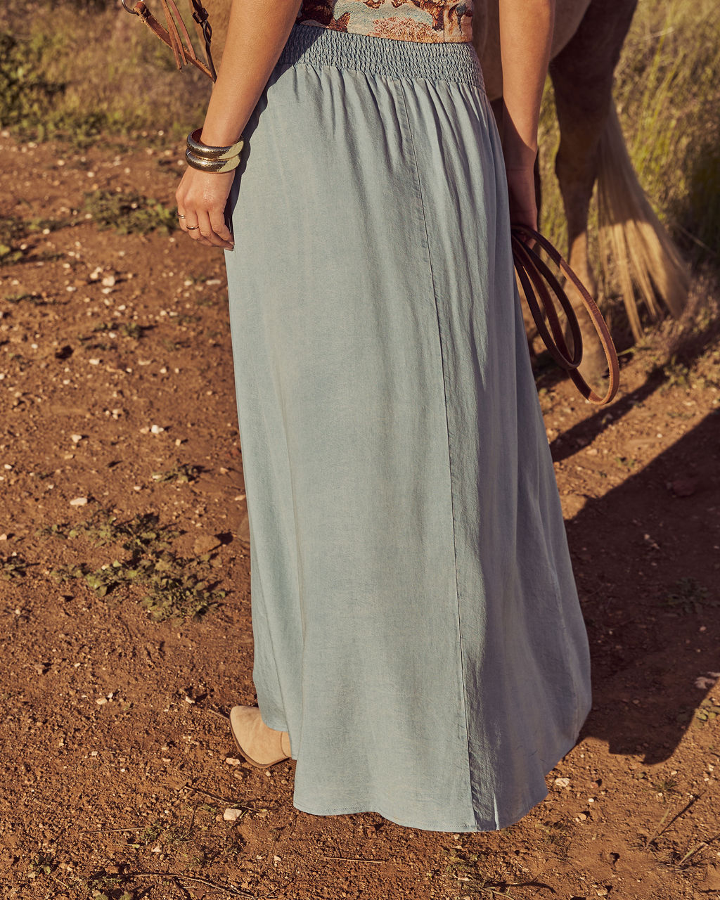 Step into effortless festival vibes with the Briena Chambray Maxi Skirt. where laid-back ease meets chic sophistication. Made from lightweight chambray fabric. this flowy maxi is all about movement and style. giving you that breezy. carefree feel perfect for sunny days and starry nights. The smocked waist ensures a comfy. flattering fit. while the front loop button closures add a playful. polished touch. Pair it with the matching Briena Chambray One Shoulder Crop Top for a head-turning set.