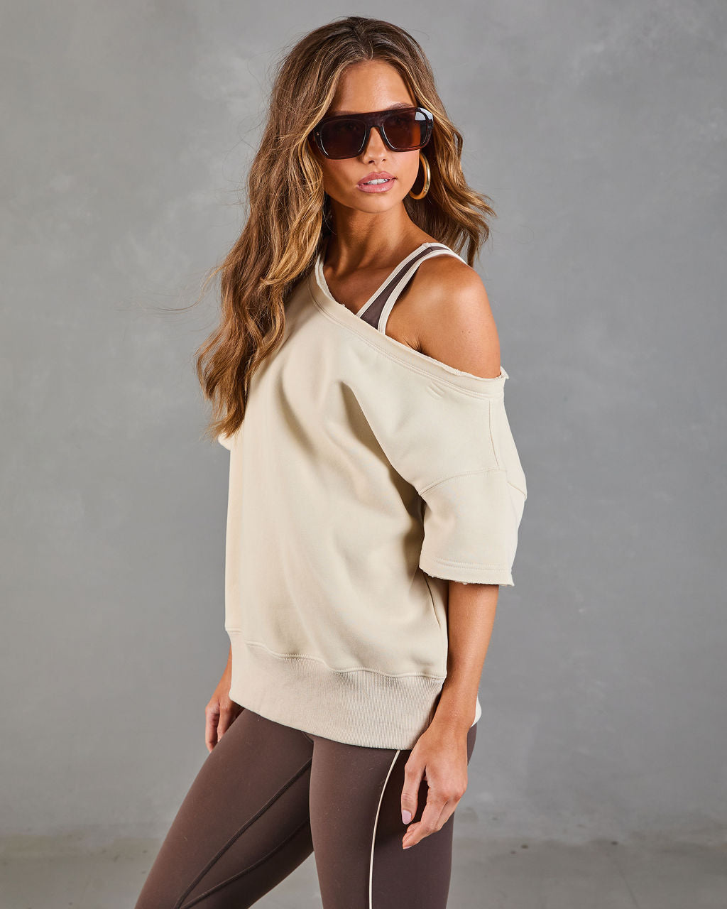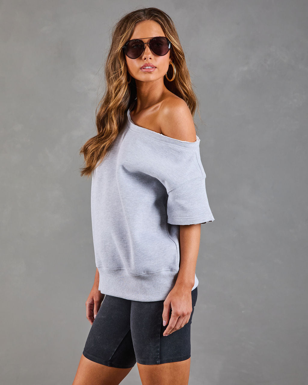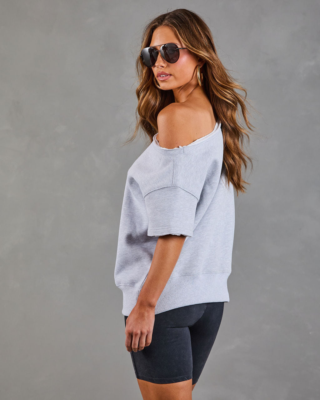 Here's to the moments you feel most yourself. wrapped in effortless style. The Empower Luxe Short Sleeve Off The Shoulder Sweatshirt is designed for chic comfort that makes a statement. Made from a cozy. midweight jersey fabric with a soft fleece lining. it's the perfect blend of luxurious and laid-back. The off-the-shoulder neckline with raw-cut trims adds a touch of playful edge.