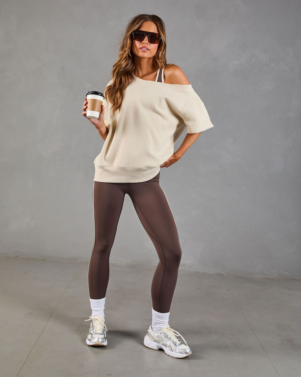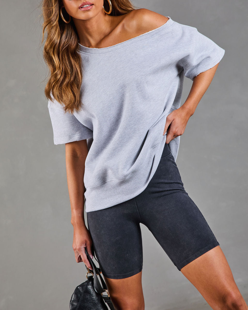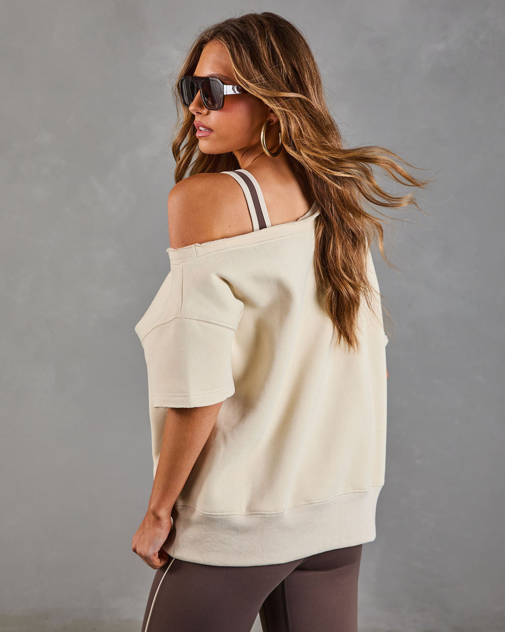 Here's to the moments you feel most yourself. wrapped in effortless style. The Empower Luxe Short Sleeve Off The Shoulder Sweatshirt is designed for chic comfort that makes a statement. Made from a cozy. midweight jersey fabric with a soft fleece lining. it's the perfect blend of luxurious and laid-back. The off-the-shoulder neckline with raw-cut trims adds a touch of playful edge.